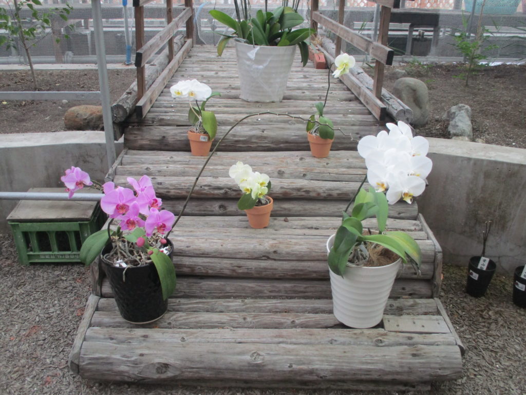 オオムラサキは現在、2齢幼虫となり来たるべき冬に備えて一生懸命エノキの葉っぱを食べています。が、なにぶん1~2センチほどの大きさのため、よほど目の良い人(視力5.0くらい?)じゃないと見えません。このままではオオムラサキコーナーが少し寂しいので、蝶は蝶でも胡蝶蘭を置いてみました。白・黄色・ピンクの胡蝶蘭をオオムラサキの代わりに眺めてみてはいかがでしょう。