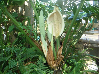 葉の切れ込みの形が特徴的なモンステラ、別名は蓬莱蕉(ホウライショウ)といい、成熟すると黄白色の花を咲かせます。
