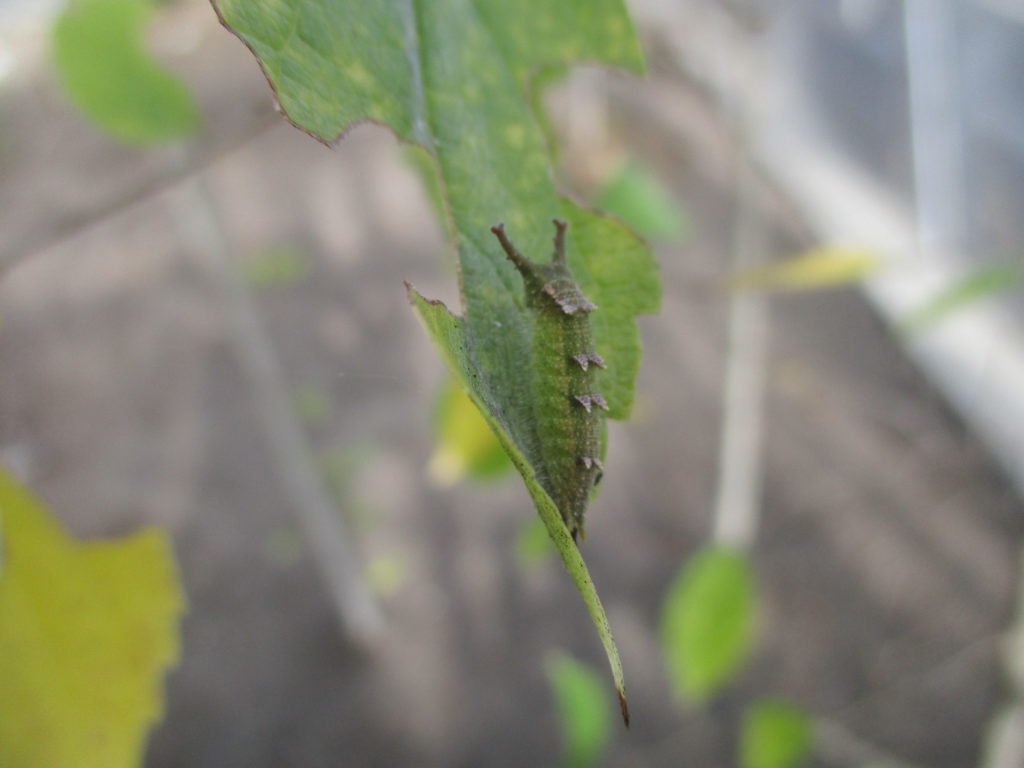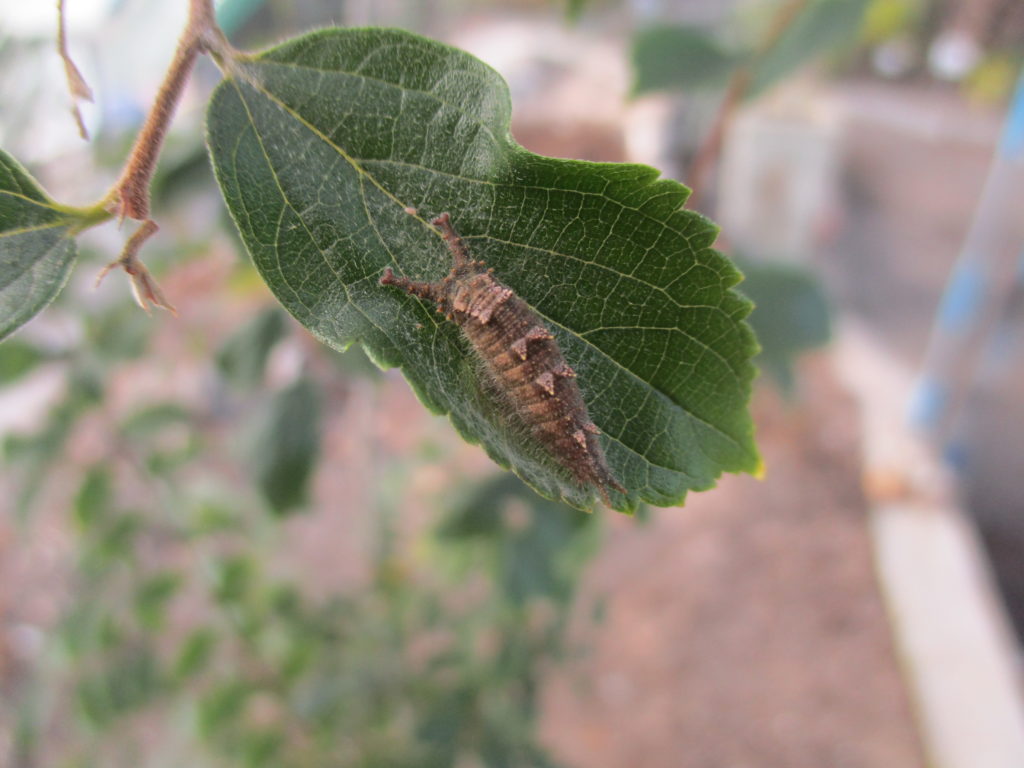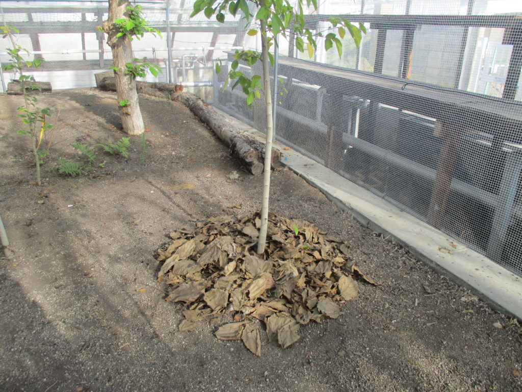 11月も半ばを過ぎ、朝晩の冷え込みが厳しさを増してくる中、オオムラサキの幼虫達も冬を迎える準備に入り始めました。餌となるエノキの葉っぱもほとんど食べなくなり、徐々に体の色が緑色から茶色へと変わってきています。この後、幼虫達はエノキの根元に敷き詰めた枯葉の布団に体を固定してじっと動かなくなり、来年の春を待ちます。