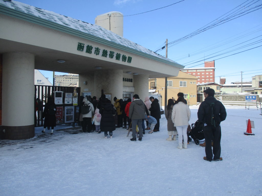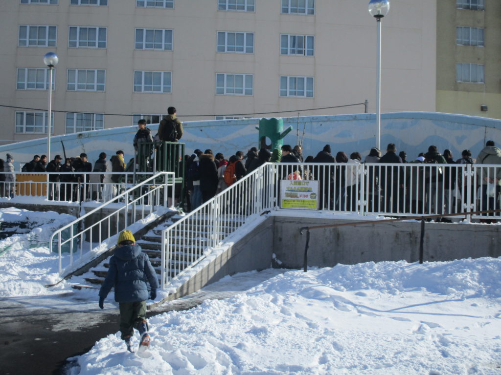 新年の営業は1月2日から始まりましたが、年末に降り積もった雪が残って足元の悪い中、たくさんのお客さまが開園を待ちわびて門の前に行列ができるほどでした。受付を済ませて新年のプレゼントを受け取ったお客様は、お目当てのサル山温泉へ一直線!観覧席はあっという間に多くのお客さまでいっぱいになりました。
