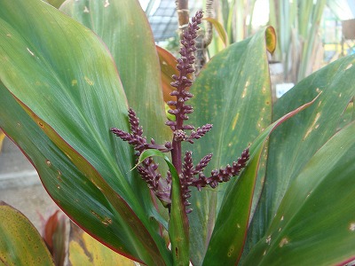 葉の縁に紅色の斑が入っているのが特徴で、紫色の花がまもなく咲きそうです
